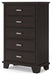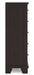 Feast your eyes on this richly versatile chest of drawers. Its traditional-inspired dark brown finish effortlessly blends with contemporary bright nickel-tone pulls to create a stunning look that's not too stuffy or too trendy. Spacious drawers offer plenty of storage for your wardrobe and spare bed linens.